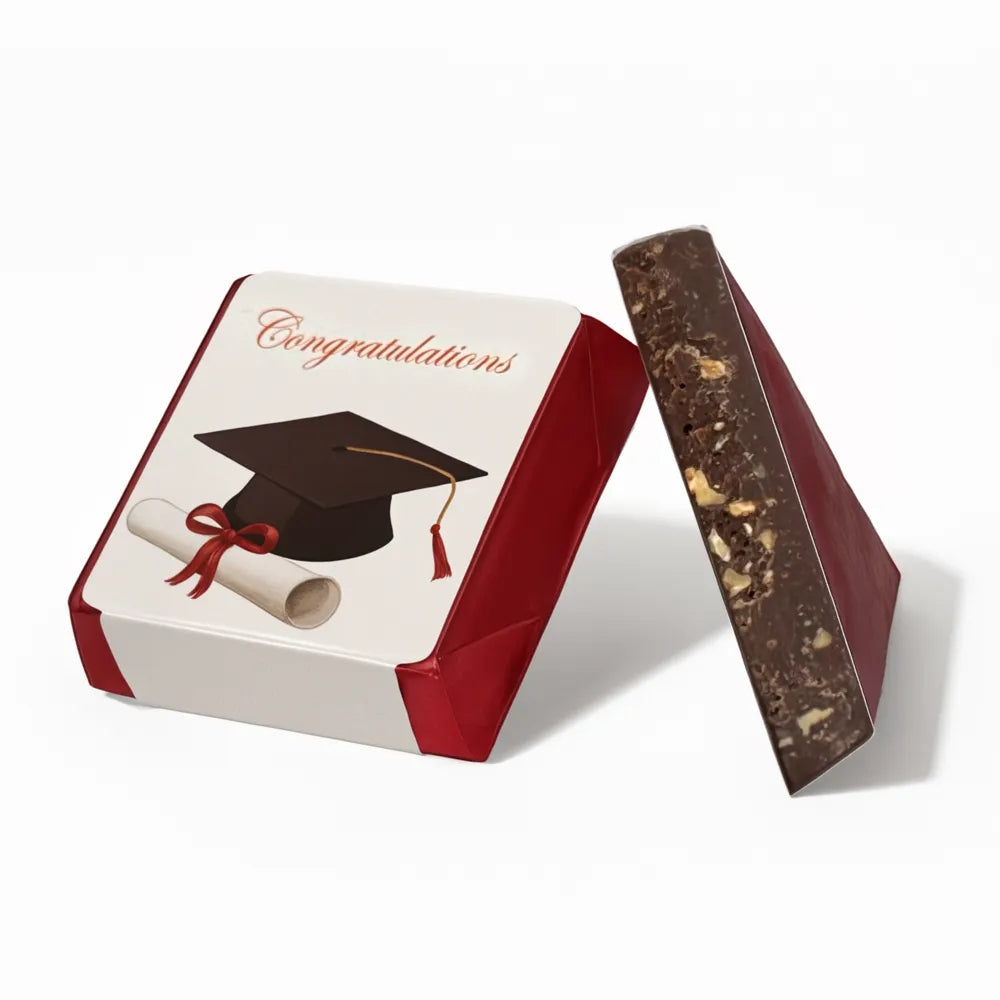 Celebrate success in style with our red-wrapped graduation chocolate, featuring premium almonds and smooth, rich chocolate — a perfect gift for proud moments.