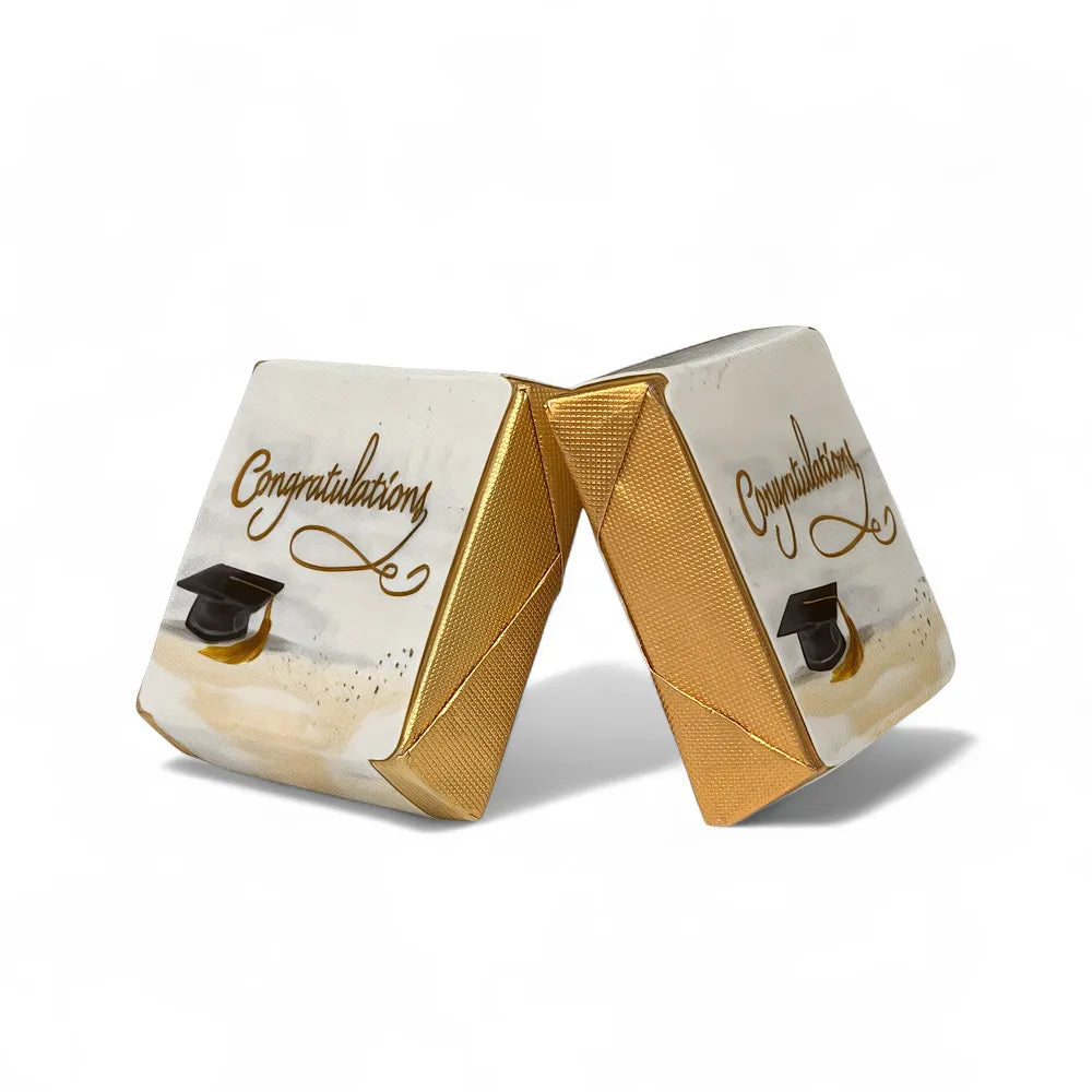 Mark the milestone with elegance — our gold-wrapped graduation chocolate blends crunchy almonds with luxurious chocolate for a gift that shines with pride.